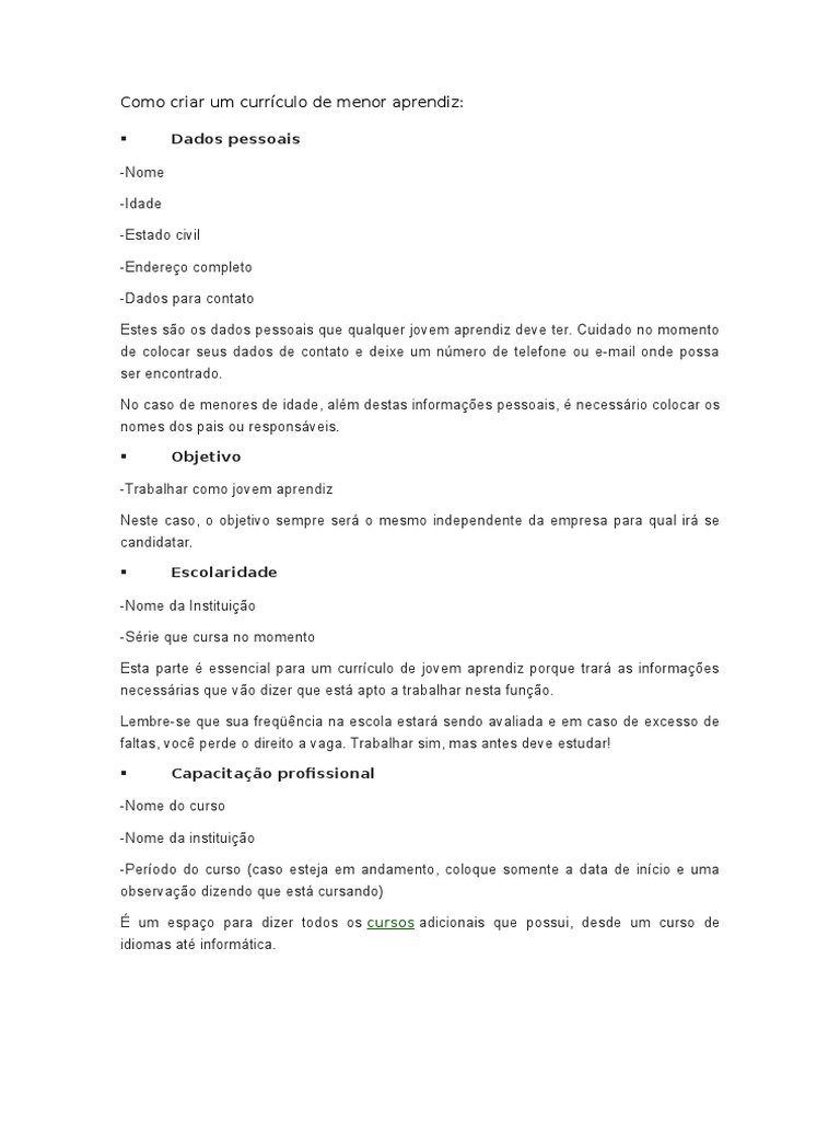 Como Fazer Um Curriculo De Jovem Aprendiz Que Nunca ... from imgv2-1-f.scribdassets.com Jovem aprendiz como fazer curriculo. Check spelling or type a new query. We did not find results for: Maybe you would like to learn more about one of these?
